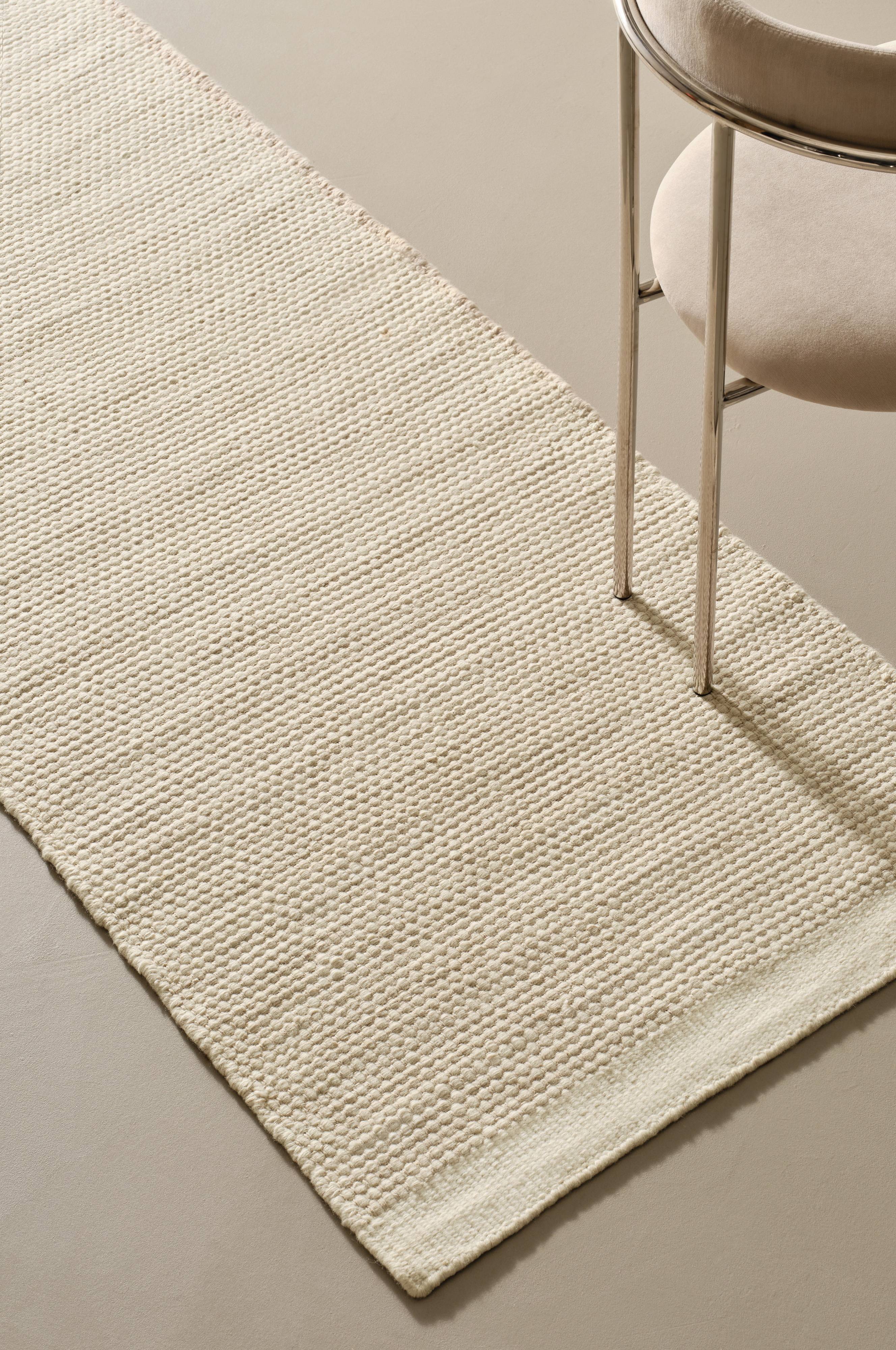 Ręcznie wykonany dywan z delikatnej wełny połączonej z bawełną. Dywan jest gładko tkany z nieco bardziej szorstkim wykończeniem i ma stylowy wygląd, który pasuje do wielu różnych stylów i trendów. Dyskretny pasek wzdłuż krótszego boku przyciąga wzrok, a dywan staje się spokojną i zrównoważoną podstawą w Twoim pokoju. Wełna, z której wykonany jest dywan, pochodzi z gospodarstw, w których owce żyją w sposób naturalny dla gatunku i w zgodzie z naturą.