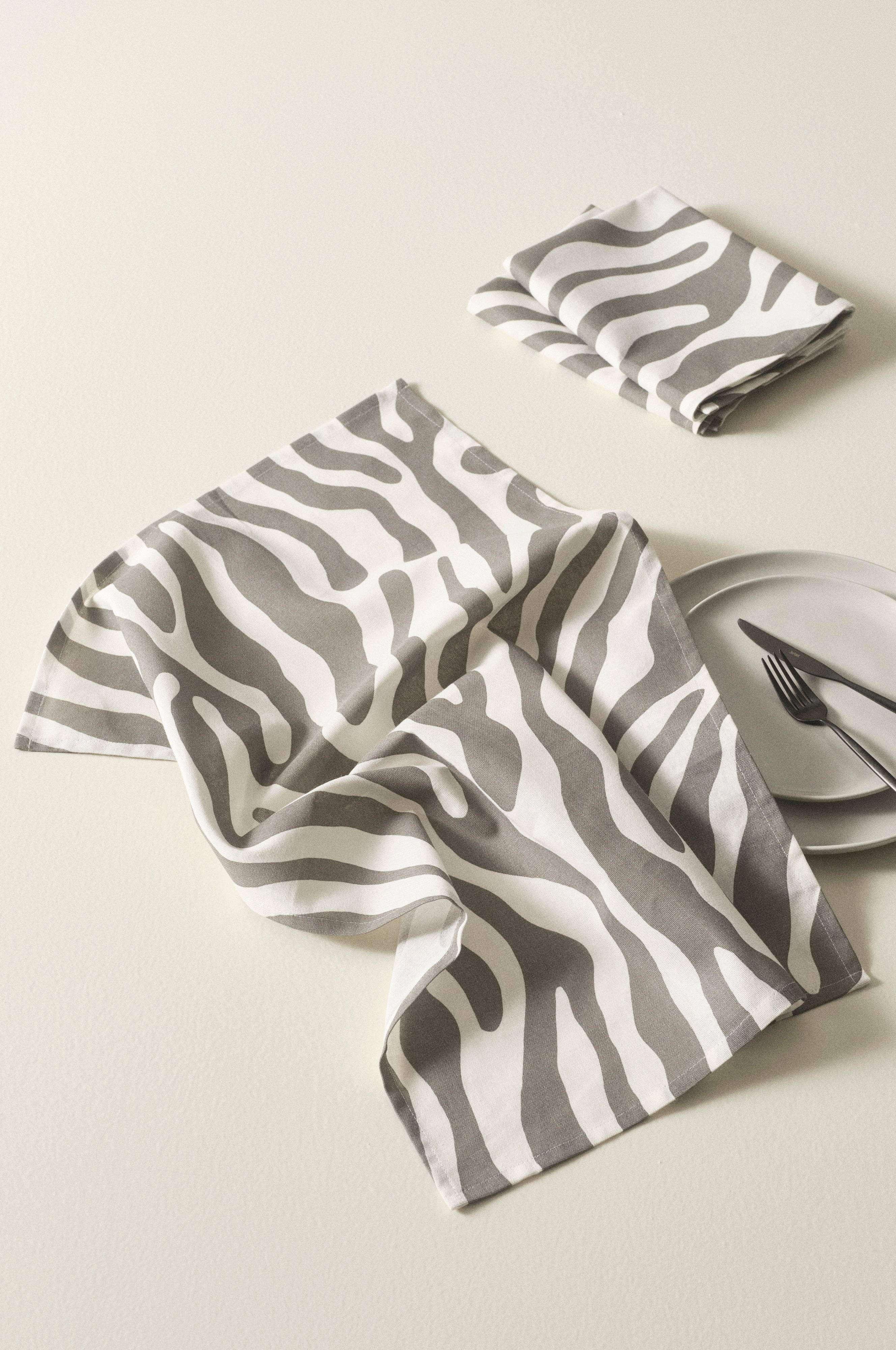 3 ręczniki kuchenne z pięknym, zwierzęcym wzorem zebry nadrukowanym na bawełnianej tkaninie. Wybierz wierną naturze wersję czarno-białą lub nieco dziką, w szalonych kolorach.