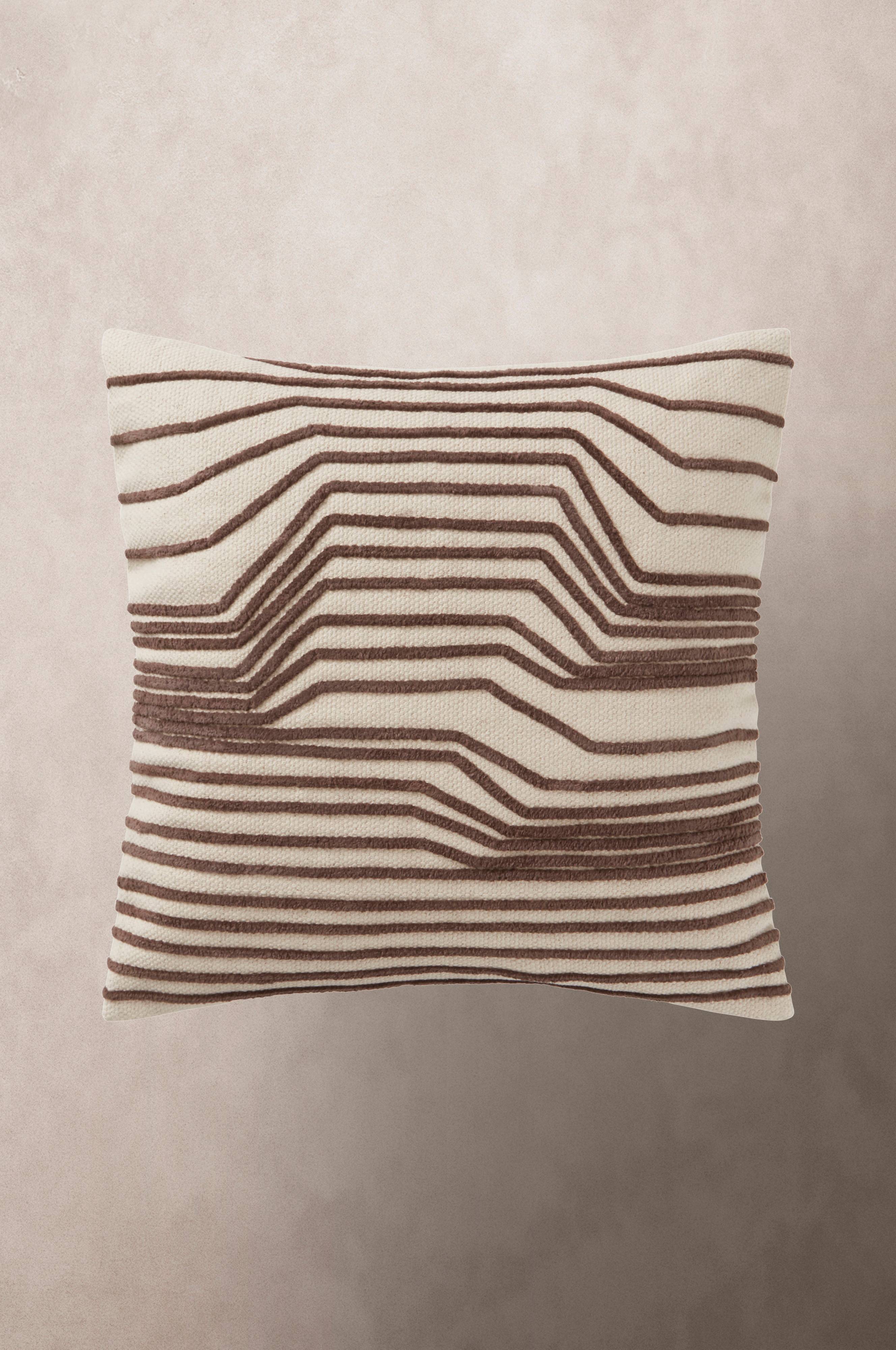 Dekoracyjna poszewka z nieco grubszej tkaniny bawełnianej z haftowanym, asymetrycznym wzorem pasków w ciemniejszym odcieniu. Tkanina na tylnej stronie jest gładka. Zamek błyskawiczny w spodniej krawędzi. Kilka nowych poduszek na sofie stworzy wrażenie nowości i świeżości.